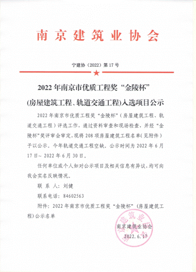 “金陵杯”是南京市建筑工程質量領域的最高榮譽,代表著全市范圍內各建筑施工企業(yè)質量管理的領先水平,評審標準高,數(shù)量控制嚴。