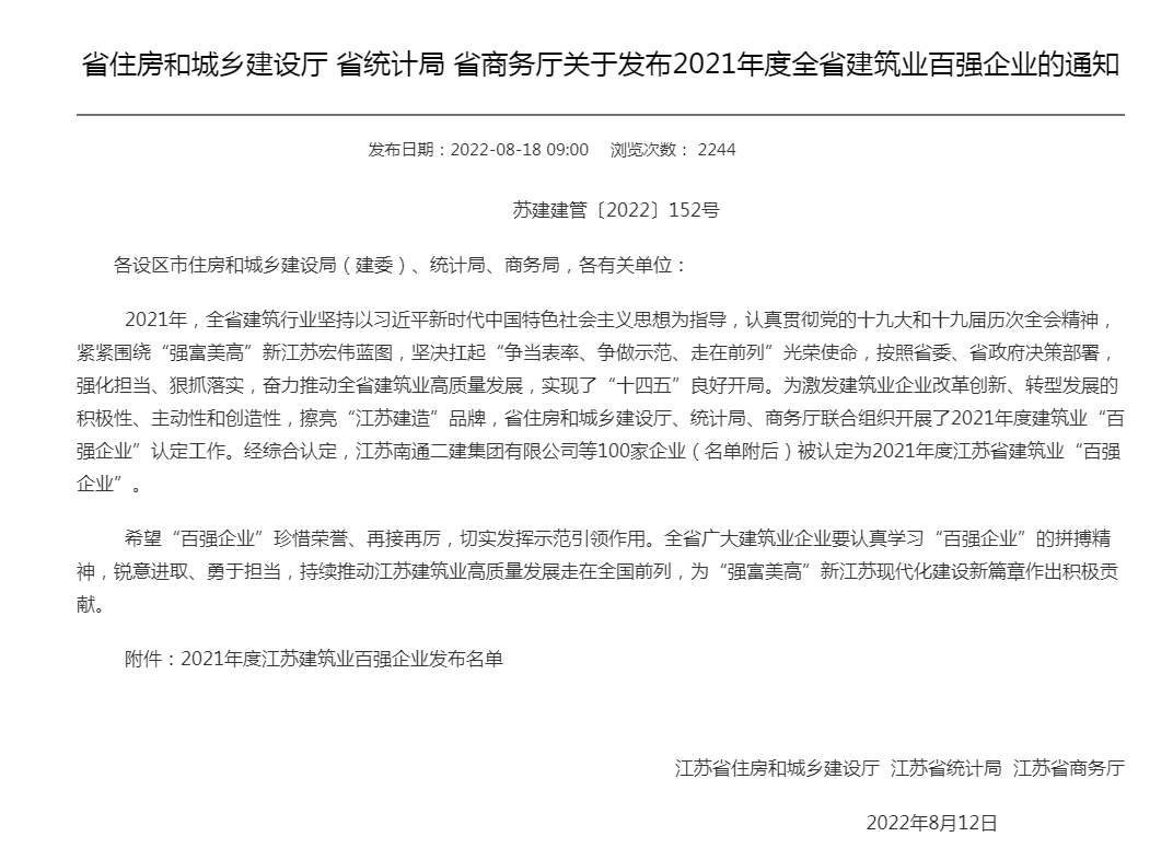 8月18日,2021年度江蘇省建筑業(yè)百強(qiáng)企業(yè)最終名單公布,集團(tuán)榮獲“2021年度江蘇省建筑業(yè)百強(qiáng)企業(yè)”榮譽(yù)稱號,充分展現(xiàn)了集團(tuán)綜合實(shí)力和品牌影響力。