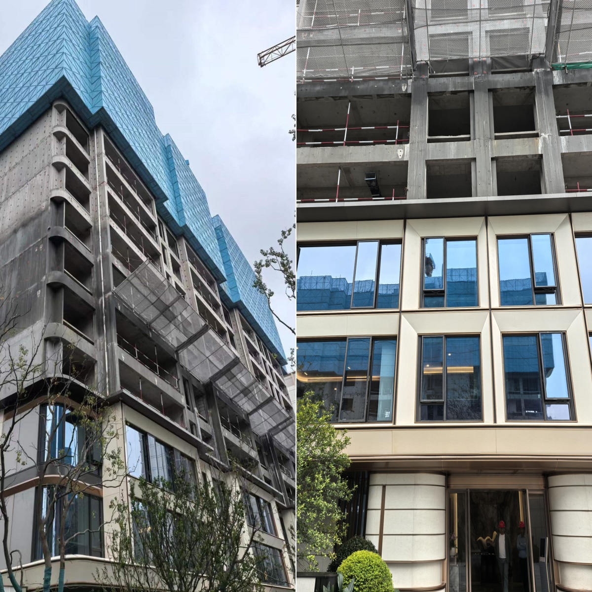 目前,項目是外裝飾、二次結(jié)構(gòu)、主體結(jié)構(gòu)的三階段同步施工,項目部按業(yè)主要求,與分包單位精心謀劃、組織實施。同時,為保證樣板展區(qū)訪客安全,項目部還創(chuàng)新采用了后掛式挑網(wǎng)等安全措施,進(jìn)一步提升了施工現(xiàn)場的安全保障水平。從外立面看,項目層次分明,立體感強(qiáng),展現(xiàn)出獨特的建筑美感。