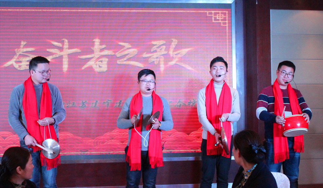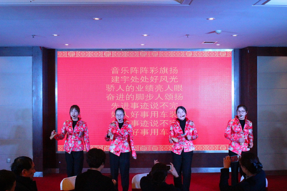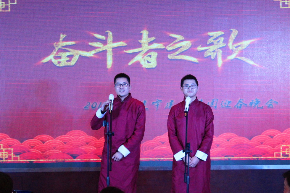 年會(huì)在董事長(zhǎng)管民良“奮斗、團(tuán)結(jié)”的致辭中開場(chǎng),全體建宇人歡聚一堂,其樂融融。每個(gè)分公司、部門和集團(tuán)皇華酒店都為年會(huì)精心準(zhǔn)備了節(jié)目,展示大家工作能力以外的多才多藝,博得了陣陣掌聲,大家在歡聲笑語中分享成功,共敘友情。其中,工程部和財(cái)務(wù)部聯(lián)合表演的詩朗誦、市政公司的三句半、南京公司的相聲、皇華酒店的音樂快板才藝超群。最后集團(tuán)公司的高層領(lǐng)導(dǎo)們一曲《眾人劃槳開大船》將年會(huì)推向了高潮。