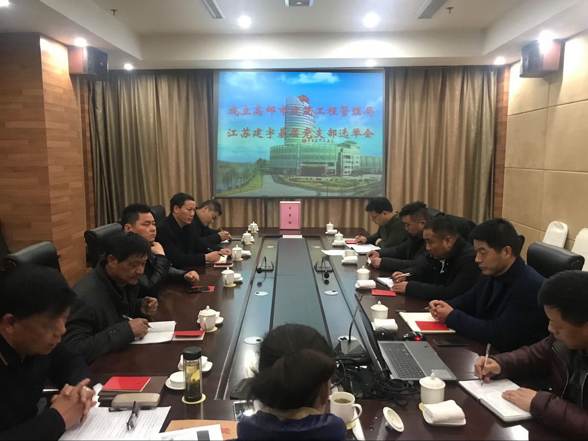 2018年2月28日,在中共高郵市委市級機關工作委員會的關心下,在中共高郵市建筑工程管理局總支部委員會的組織下,“中共江蘇建宇建設集團有限公司支部委員會”成立大會在皇華國際大酒店四樓一號會議室隆重召開。公司董事長管民良、副總張?zhí)焯摇⒇攧湛偙O(jiān)郭正基等黨員參加成立大會。