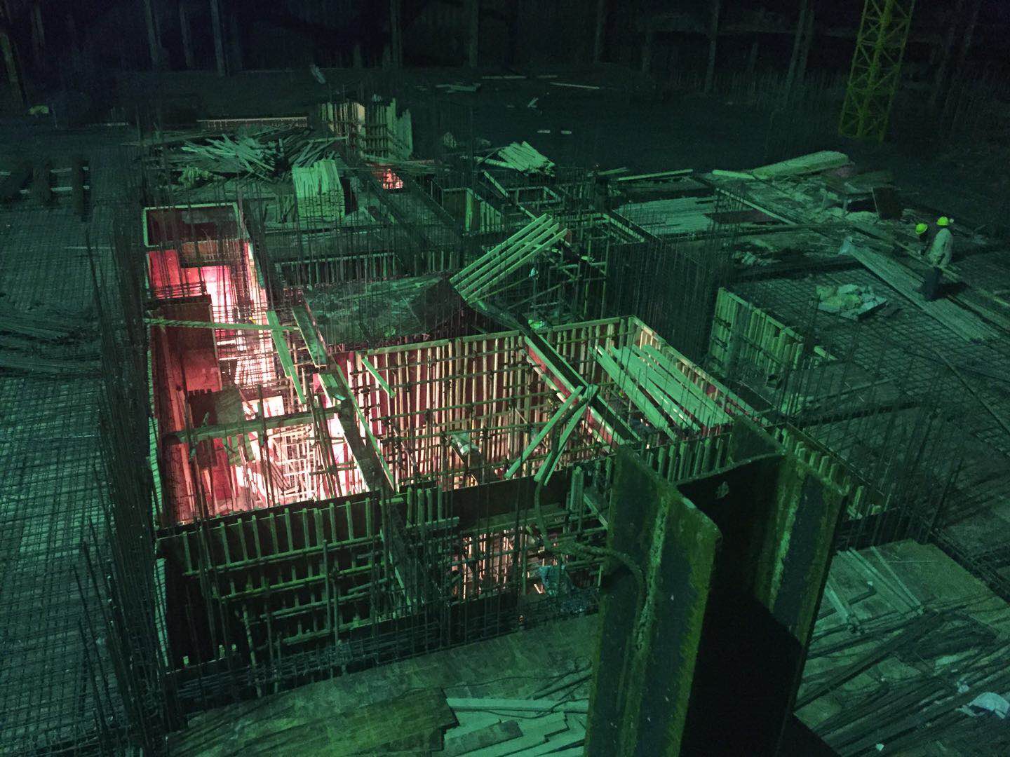 為配合甲方銷售節(jié)點(diǎn)的實(shí)現(xiàn),1號(hào)樓從2018年2月3日再次沖鋒——負(fù)二層結(jié)構(gòu)開始施工,必須在2月12日(臘月二十七)前砼澆筑完畢。1號(hào)樓主樓地庫(kù),單層面積3200平方米,負(fù)二層結(jié)構(gòu)框架柱最大截面尺寸達(dá)1200mm*1700mm,梁最大截面尺寸達(dá)750mm*950mm,且該區(qū)域全部為人防口部,剪力墻多,施工任務(wù)重、難度大。如按照正常的施工程序,如此大面積的人防地庫(kù)需要20天左右。現(xiàn)又是春節(jié)臨近,材料、人員嚴(yán)重匱乏,同時(shí)又要在原有工期上縮短一半,難度可想而知。這個(gè)重任落在了勞務(wù)經(jīng)理任永艮項(xiàng)目部,他們積極服從南京公司大局,抽調(diào)精兵強(qiáng)將支援,交叉作業(yè)、平行施工、見縫插針、輪班作業(yè),能用的招都用上,力爭(zhēng)打響攻堅(jiān)大會(huì)戰(zhàn)。