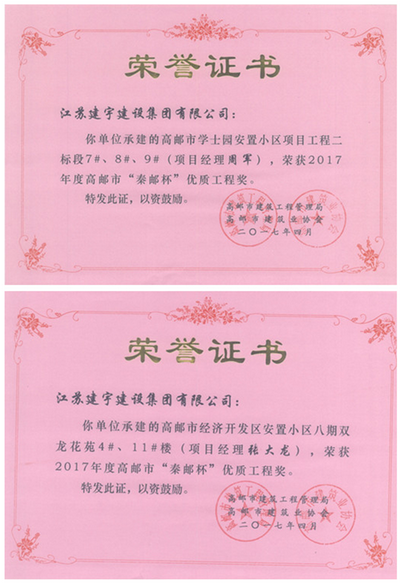 由高郵市建筑工程管理局和高郵市建筑業(yè)協(xié)會(huì)組織的2017年度高郵市“秦郵杯”建筑(裝飾、市政)優(yōu)質(zhì)工程評(píng)選結(jié)果日前揭曉,集團(tuán)高郵公司承建的“高郵市學(xué)士園安置小區(qū)項(xiàng)目工程二標(biāo)段7#、8#、9#樓”和“高郵市經(jīng)濟(jì)開(kāi)發(fā)區(qū)安置小區(qū)八期雙龍花苑4#、11#樓”兩項(xiàng)工程獲獎(jiǎng)。