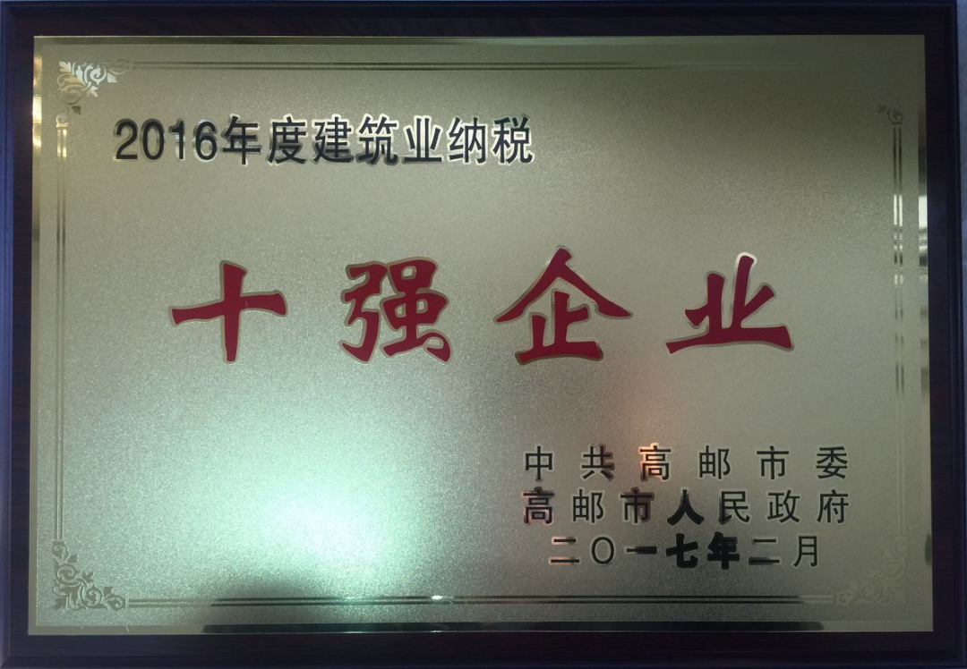 2017年2月6日,從高郵市政府舉行的高郵市建筑業(yè)發(fā)展大會上傳來喜訊:我集團(tuán)被授予“高郵市建筑業(yè)納稅十強(qiáng)企業(yè)”榮譽(yù)稱號。