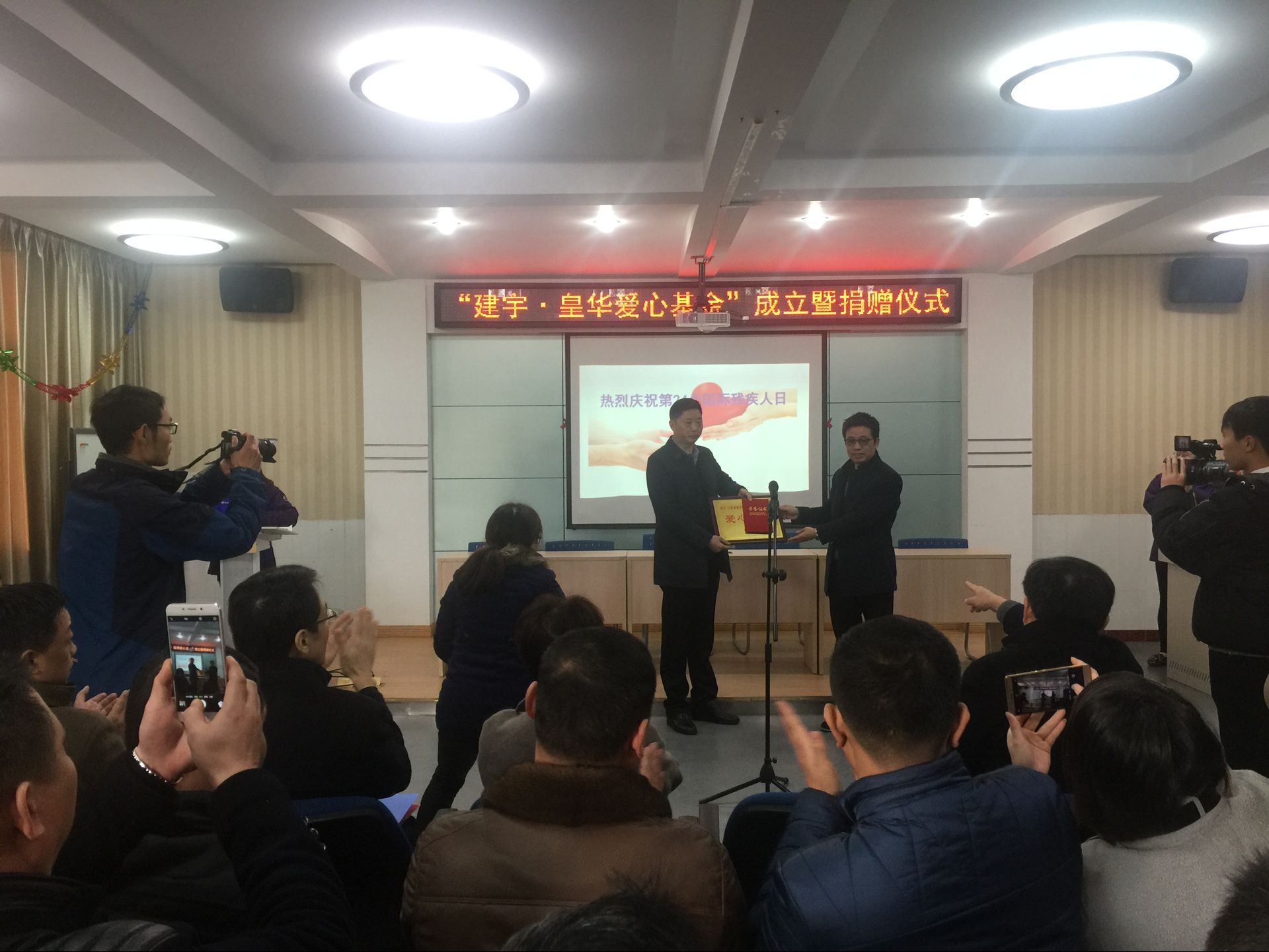 荷花塘特校劉春林校長致歡迎詞,對建宇?皇華愛心基金的捐贈表達(dá)了謝意和敬意,并表示按捐贈協(xié)議規(guī)范用好善款,發(fā)揮其最大功效。市教育局邵局長高度評價了建宇集團的此項善舉,對一直支持教育事業(yè)、熱衷公益的管民良董事長表示感謝,盛贊集團是高郵的重要企業(yè),是一個社會責(zé)任感很強的企業(yè),多年來得到了社會各界的好評。隨后董事長管民良代表集團捐贈,皇華國際大酒店王衛(wèi)紅董事長代表集團簽約,殘聯(lián)吉平副理事長為建宇集團及管民良董事長頒發(fā)“愛心單位”牌匾和“愛心使者”證書,特校學(xué)生還表演了精心準(zhǔn)備的文藝節(jié)目。