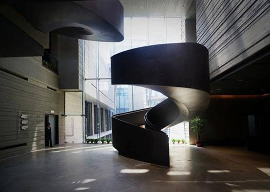 項目采用了清水混凝土施工,木紋清水混凝土元素樸素的風(fēng)格,將建筑與自然融合的更加的完美。接近于360度的雙層螺栓樓梯也是一大亮點,由于中間沒有穩(wěn)定支點,變形帶有懸挑特性,很難控制其撓度和應(yīng)力。經(jīng)過我單位的二次深化,對傳統(tǒng)樓梯結(jié)構(gòu)進(jìn)行了一系列的創(chuàng)新與優(yōu)化。