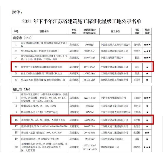 近日,集團項目創(chuàng)優(yōu)奪牌再獲佳績:南京分公司承建的江蘇智慧城市地下空間產業(yè)園項目榮獲2022年南京市優(yōu)質工程獎“金陵杯”,南京分公司承建的南京理工大學基礎學科教學樓科研樓項目和宿遷分公司承建的藍灣雅居項目榮獲江蘇省2021年下半年“省級建筑施工安全標準化星級工地項目”稱號。