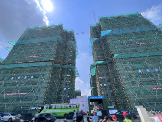 觀摩團第一站:天賦星辰項目,該項目建筑面積為107121.54 ㎡,其中地上12 棟單體住宅樓建筑面積為74340.92 ㎡,地下為一層車庫及人防,建筑面積為32780.62 平米。目前已經(jīng)有8 棟全部封頂, 3棟樓二次結(jié)構(gòu)快要完成,3棟屋面做法及外墻抹灰完成,2棟屋面做法正在施工。