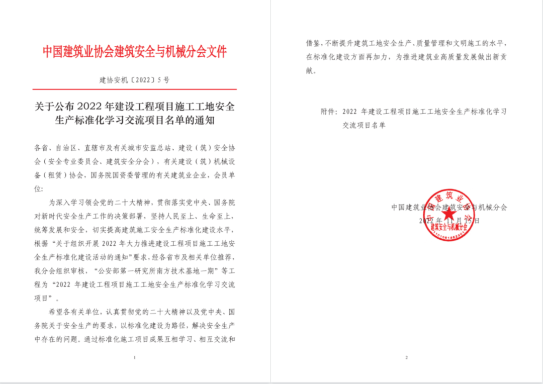 近日,中國建筑業(yè)協(xié)會(huì)安全與機(jī)械分會(huì)發(fā)布了2022年建設(shè)工程項(xiàng)目施工工地安全生產(chǎn)標(biāo)準(zhǔn)化學(xué)習(xí)交流項(xiàng)目名單,集團(tuán)南京分公司承建的國際化名醫(yī)中心項(xiàng)目安全標(biāo)準(zhǔn)化建設(shè)成績顯著,被授予“國家安全生產(chǎn)標(biāo)準(zhǔn)化項(xiàng)目”榮譽(yù)稱號(hào)(原國家AAA工地)。