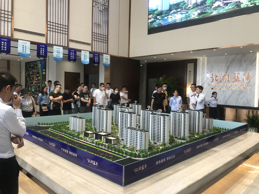 項(xiàng)目總牛瑞峰熱情接待了觀摩團(tuán)一行,在華麗大氣的銷售中心大廳沙盤區(qū)域,介紹了北湖藍(lán)灣設(shè)計(jì)理念、項(xiàng)目概況、推進(jìn)速度和科技、區(qū)位、理念等優(yōu)勢。