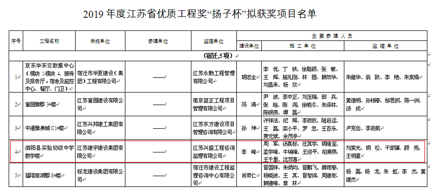 日前,2019年度江蘇省優(yōu)質(zhì)工程獎“揚(yáng)子杯”公示了,由集團(tuán)宿遷分公司承建的泗陽縣實驗初級中學(xué)工程榮獲殊榮。