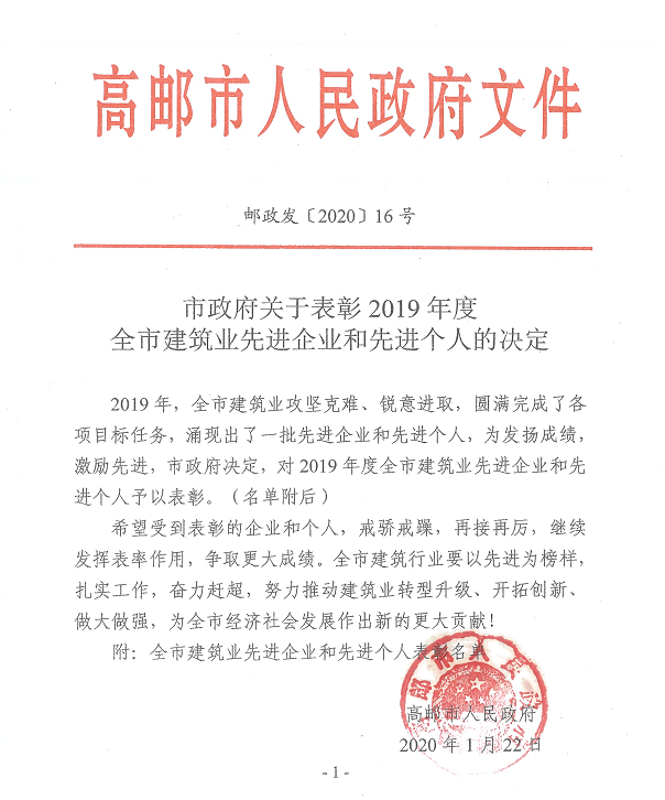 2019年我公司緊緊圍繞既定的戰(zhàn)略目標,面對低迷的建筑市場,團結奮進,爭先進位,各項經(jīng)濟指標穩(wěn)中有升,在高郵市納稅名列前茅,在揚州市納稅也取得了較好的名次。與此同時,在建筑業(yè)日趨嚴峻的形勢下,集團再次蟬聯(lián)高郵市優(yōu)秀企業(yè),也證明了企業(yè)發(fā)展理念的先導性和準確性。