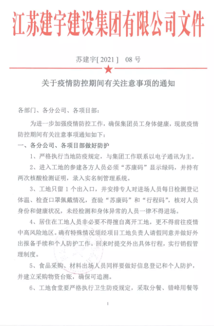 各部門(mén)和分公司迅速召開(kāi)疫情防控專(zhuān)題會(huì)議,傳達(dá)集團(tuán)疫情防控要求,對(duì)防控工作作出安排。尤其是身處疫情中心的南京和揚(yáng)州分公司各項(xiàng)目部,自疫情爆發(fā)后,各項(xiàng)目部堅(jiān)決執(zhí)行當(dāng)?shù)匾咔榉揽匾?guī)定。