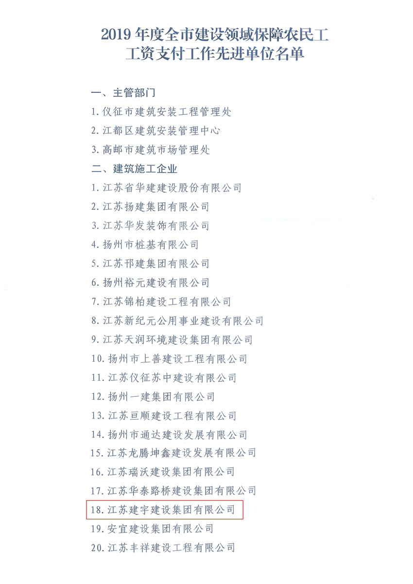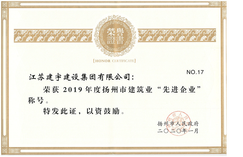 1月15日,從揚州市住建局獲悉,集團又一次被揚州市人民政府評為揚州市建筑業(yè)先進企業(yè),這是集團第九次獲此殊榮。同時集團再次榮獲了揚州市保障農(nóng)民工工資支付工作先進單位,王禮亮榮獲優(yōu)秀班組長。